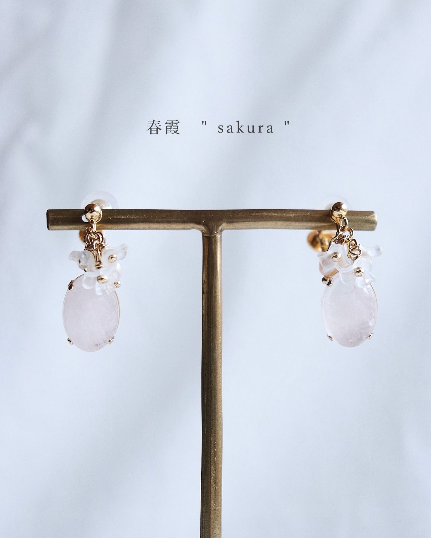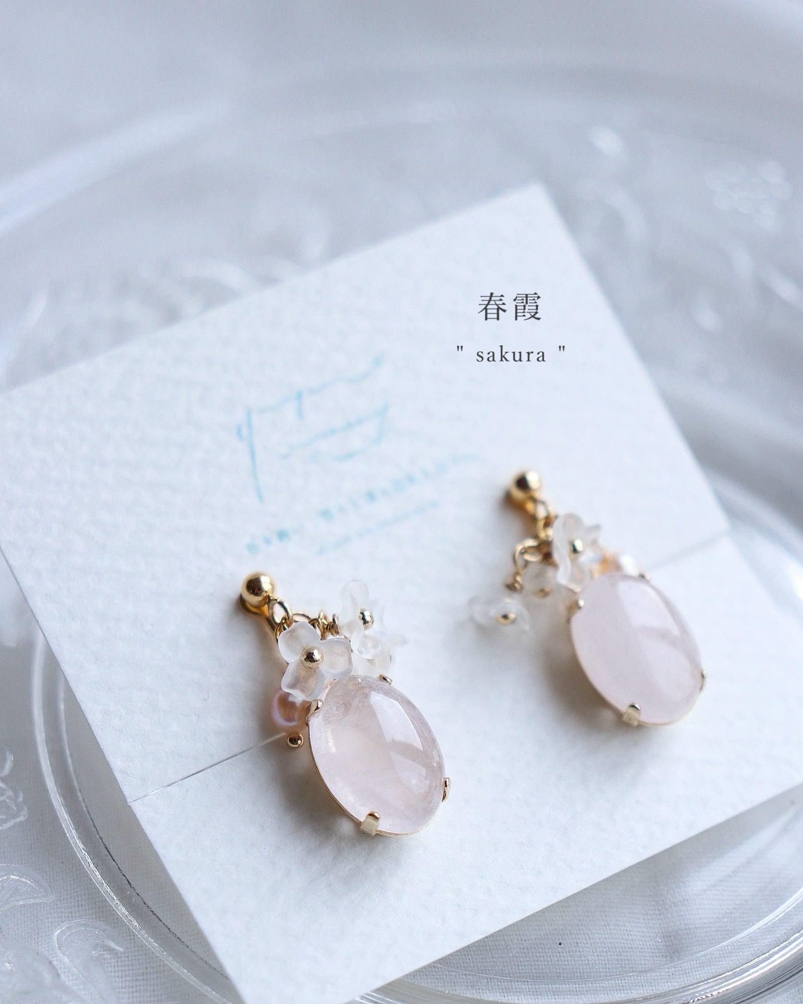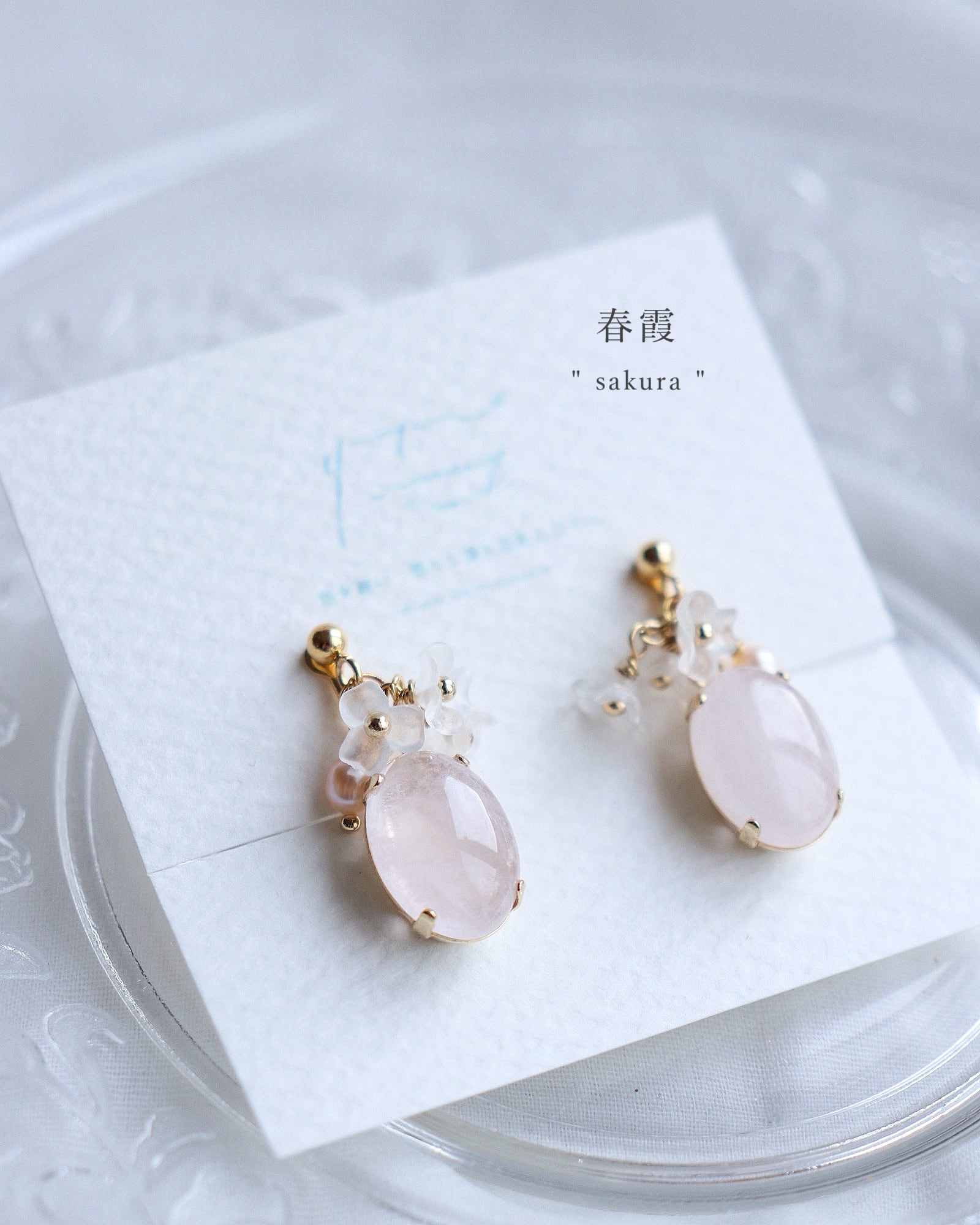 桜のようなローズクォーツの天然石の柔らかな色彩が