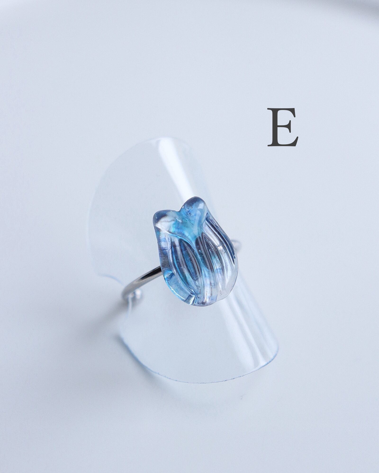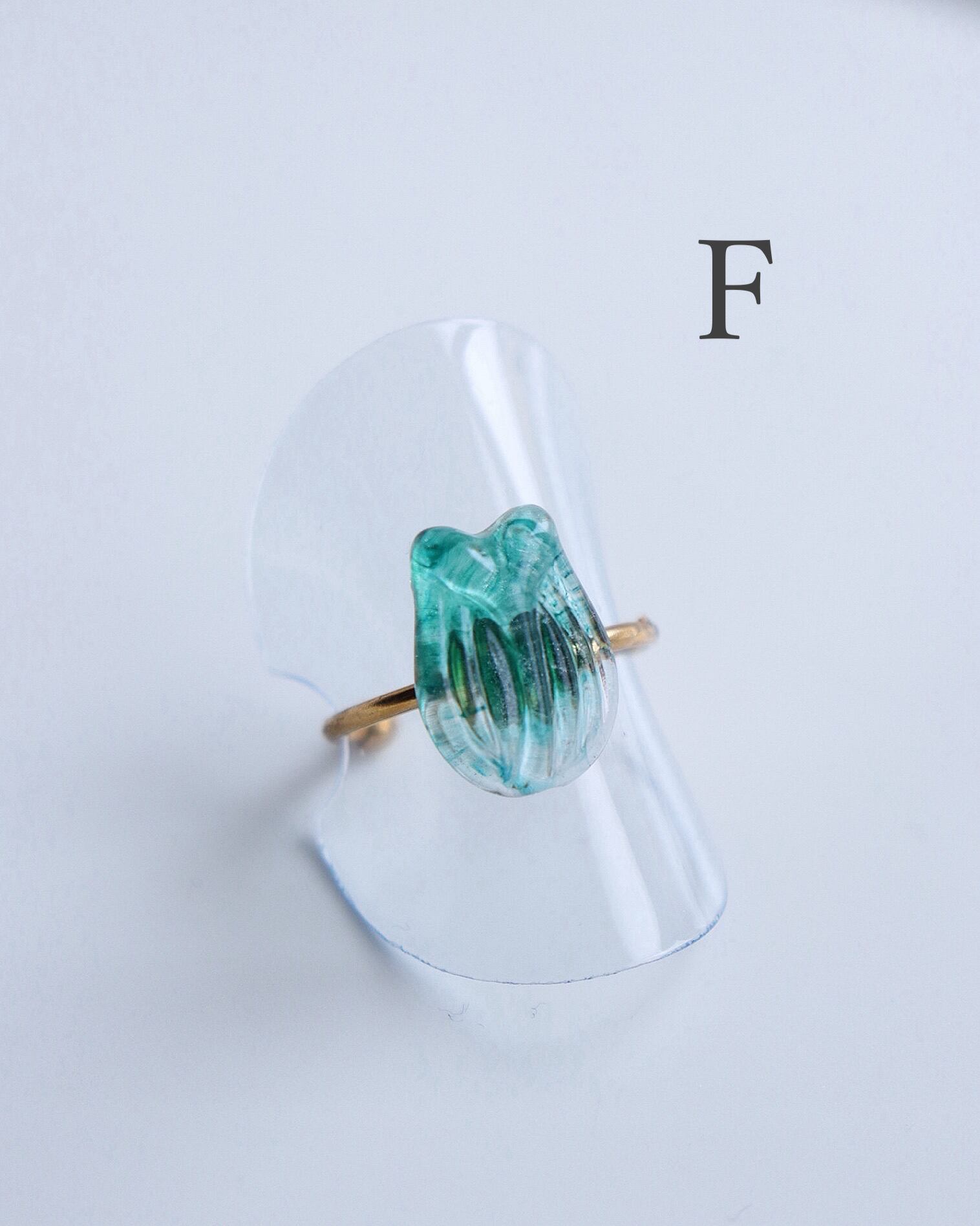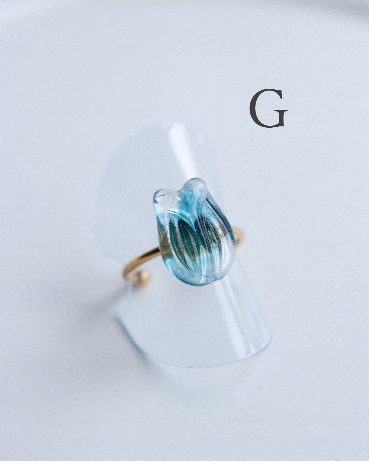 朝露のきらめきを閉じ込めた、小さなチューリップの標本のようなリングです。