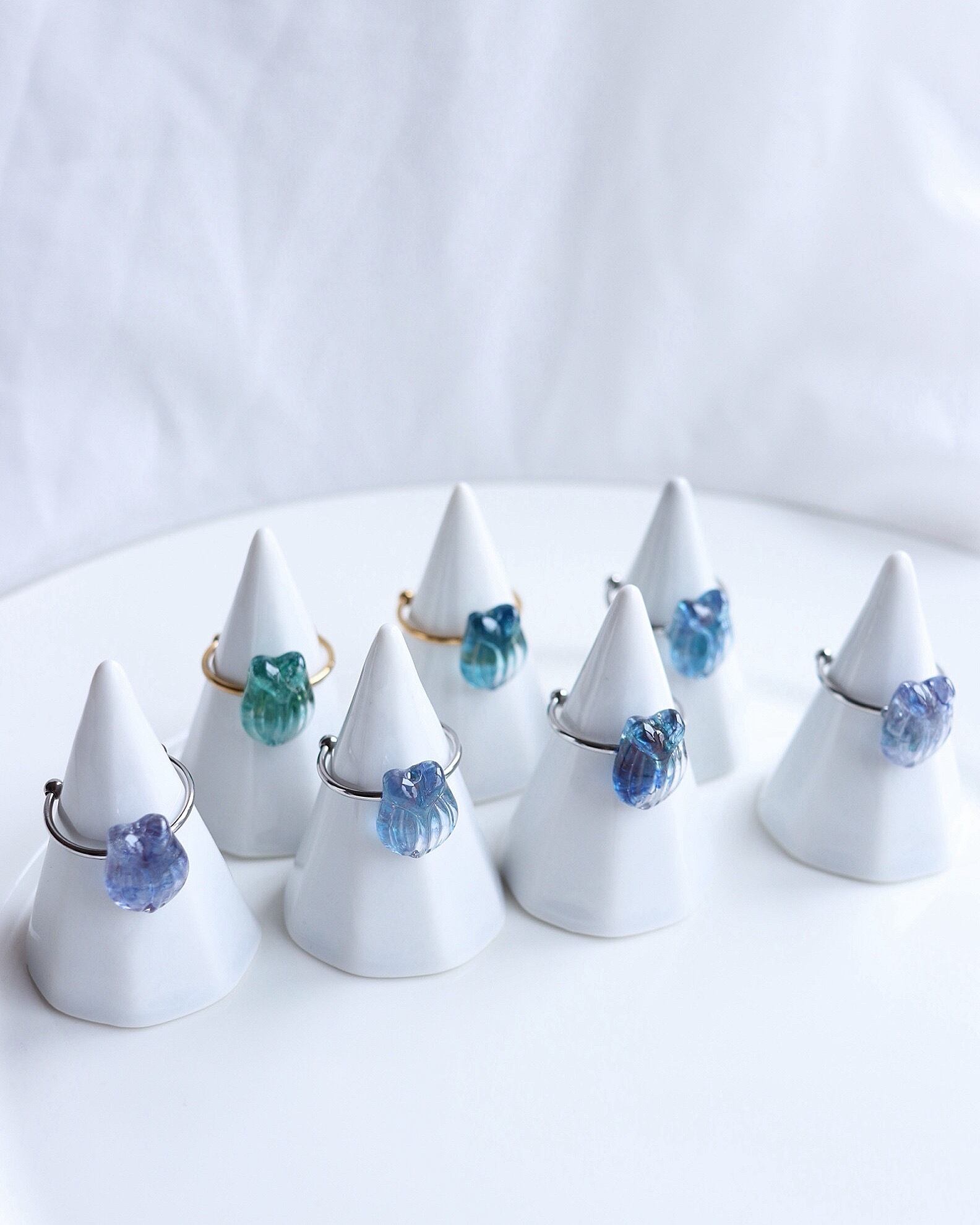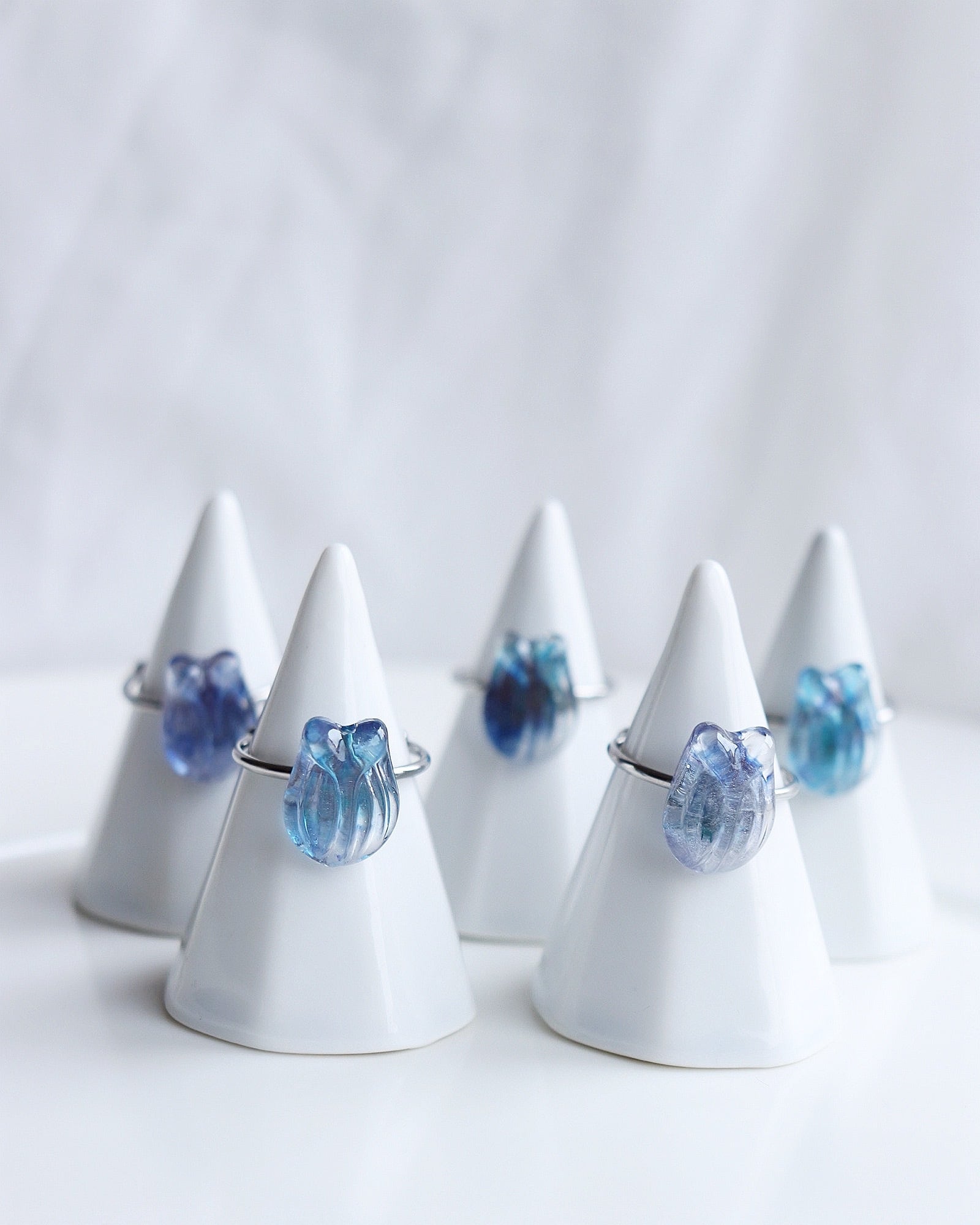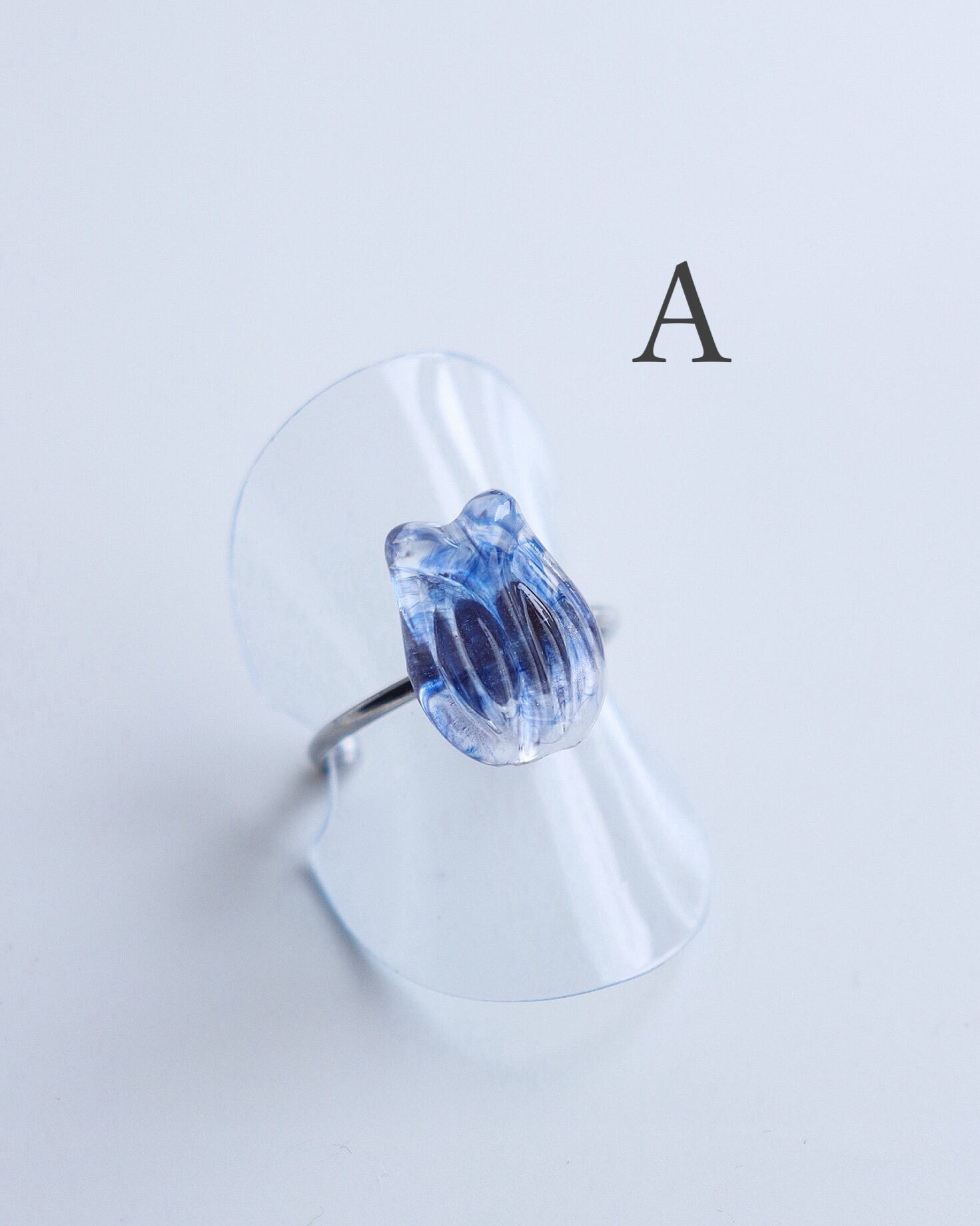 朝露のきらめきを閉じ込めた、小さなチューリップの標本のようなリングです。
