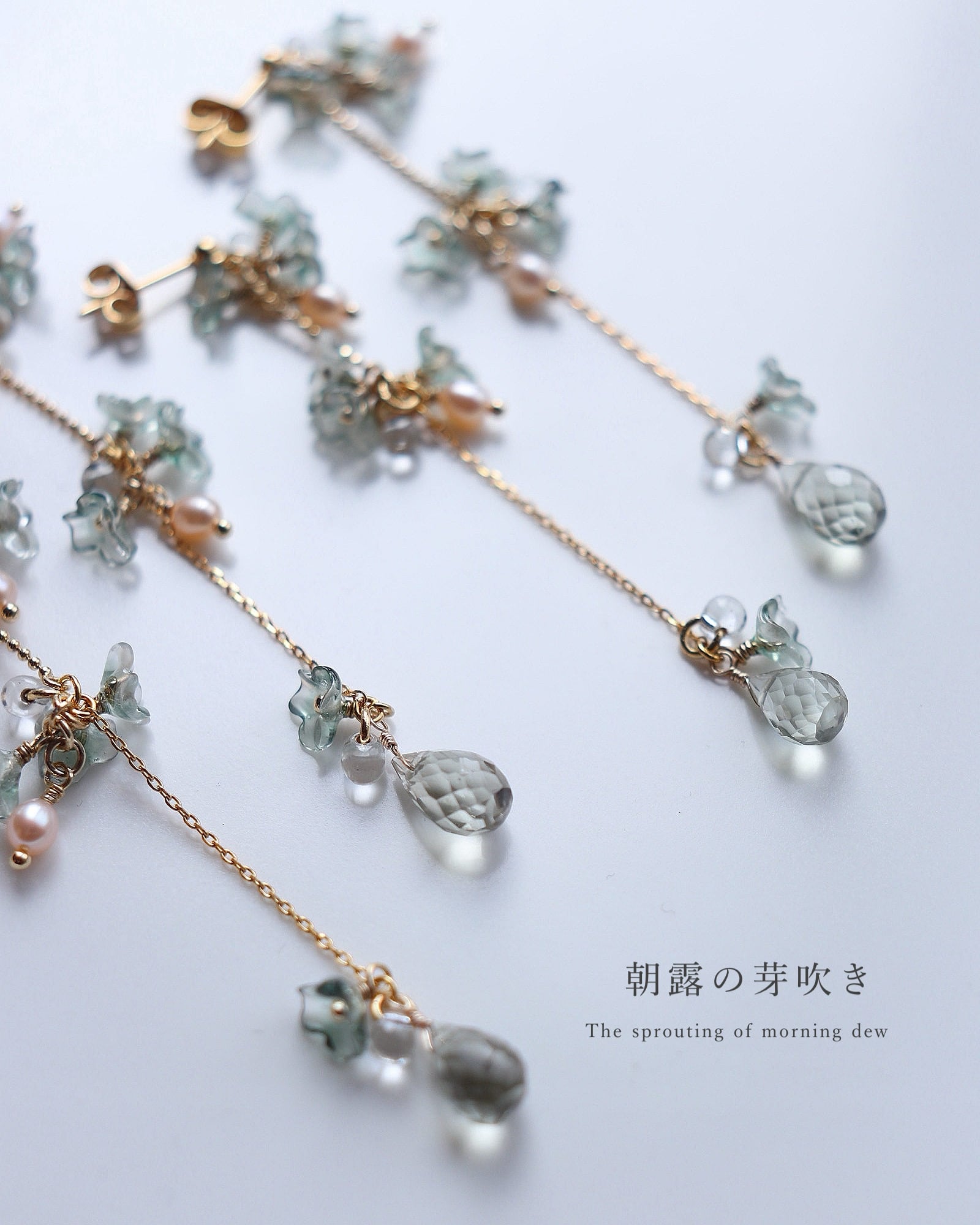 天然石のグリーンアメジストの雫の透明感と、アルコールインクでひとつひとつ色付けした花々と上質な淡水パール。みずみずしいきらめきを映し出し、軽やかに揺れる耳飾りです。