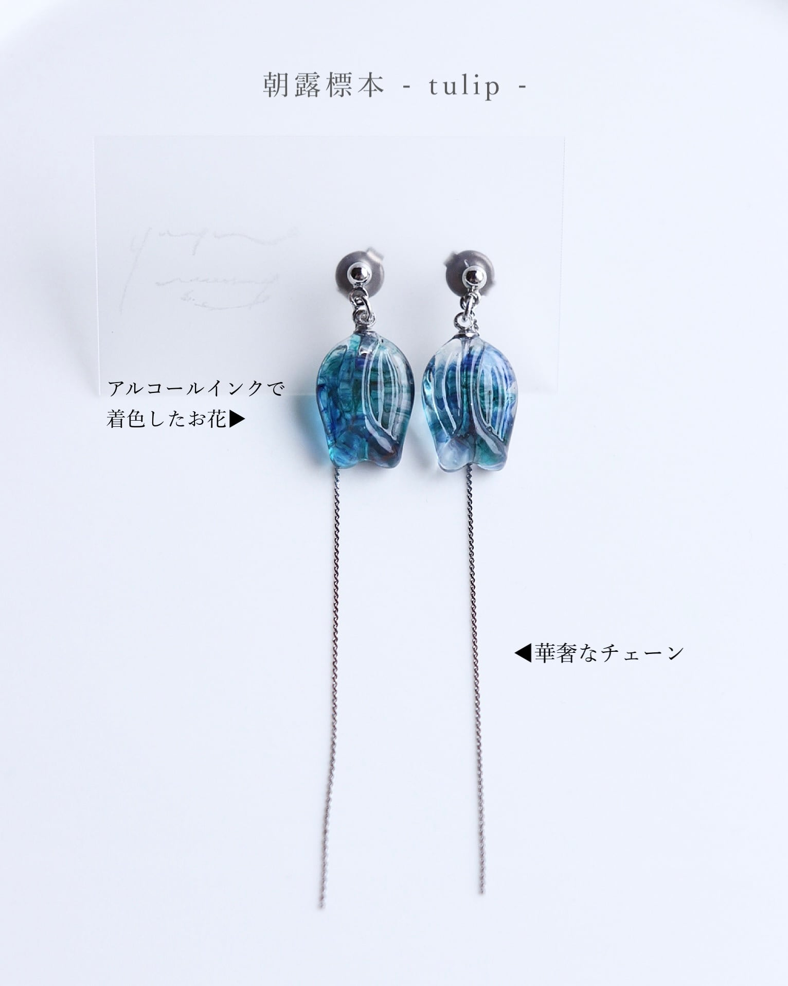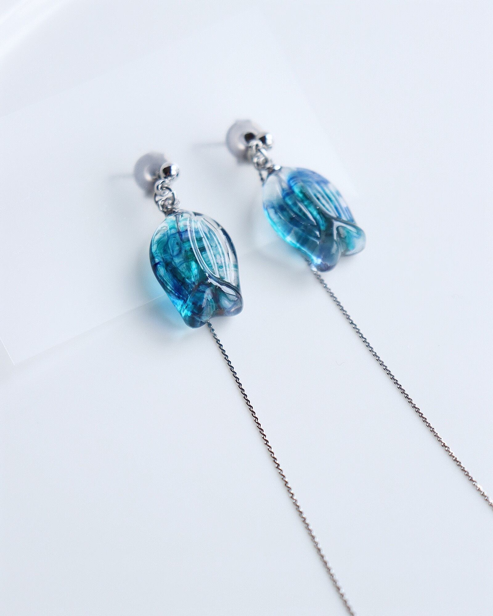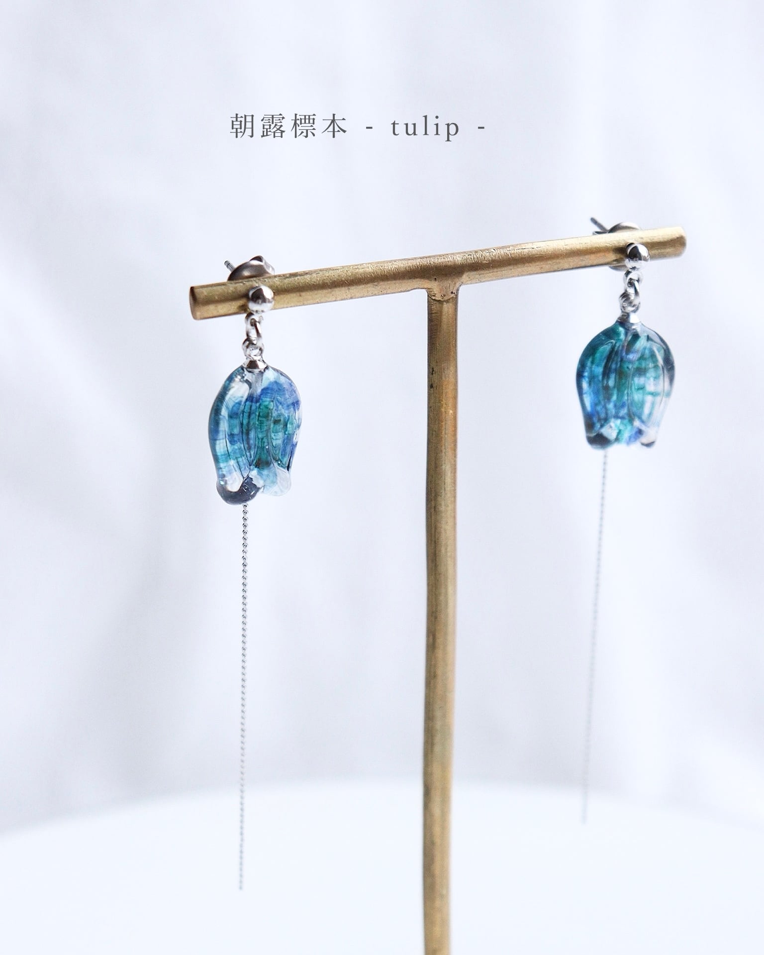 朝露のきらめきを閉じ込めた、小さなチューリップの標本のようなゆれる耳飾りです。