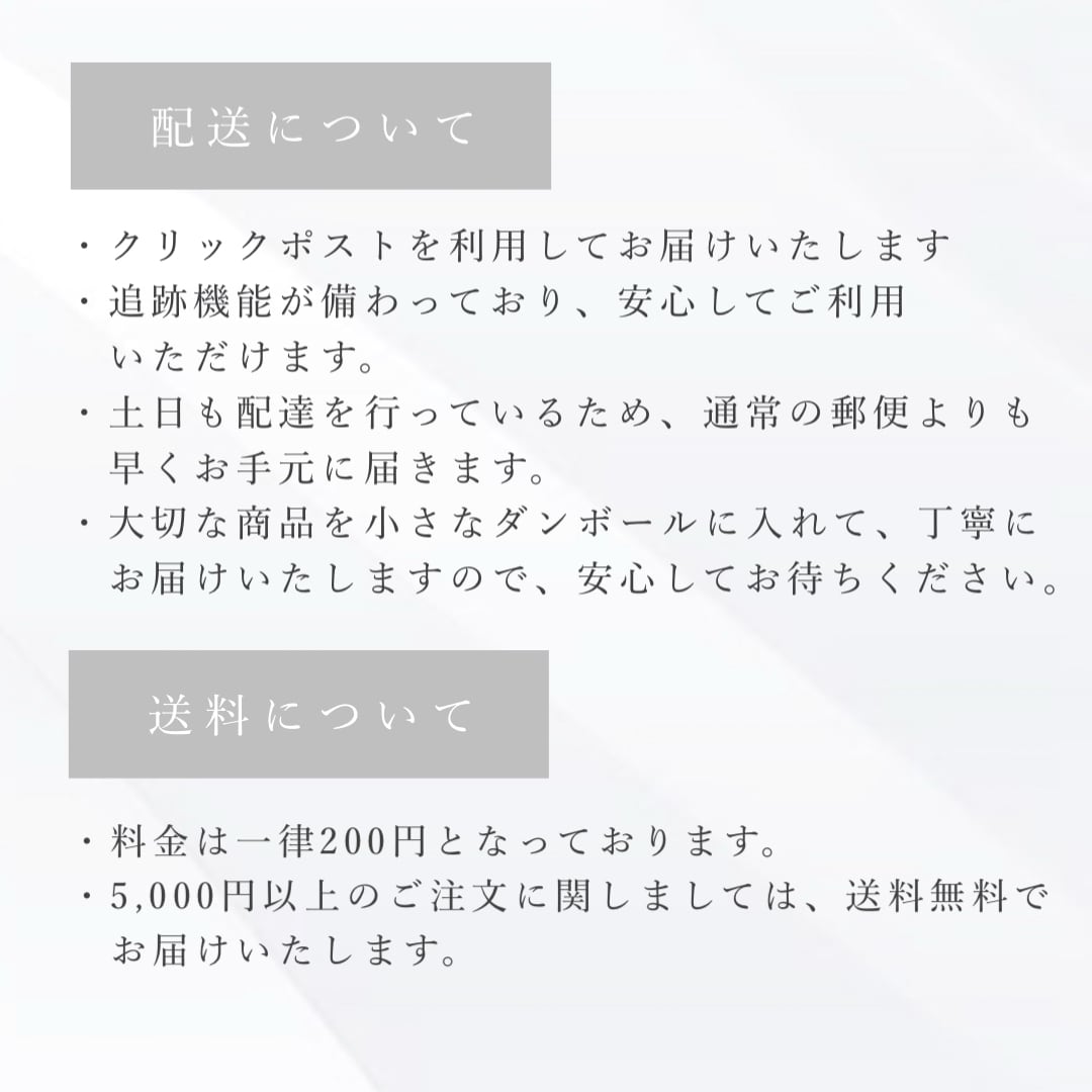 すべてのご注文は追跡付きの《クリックポスト》で発送いたします。